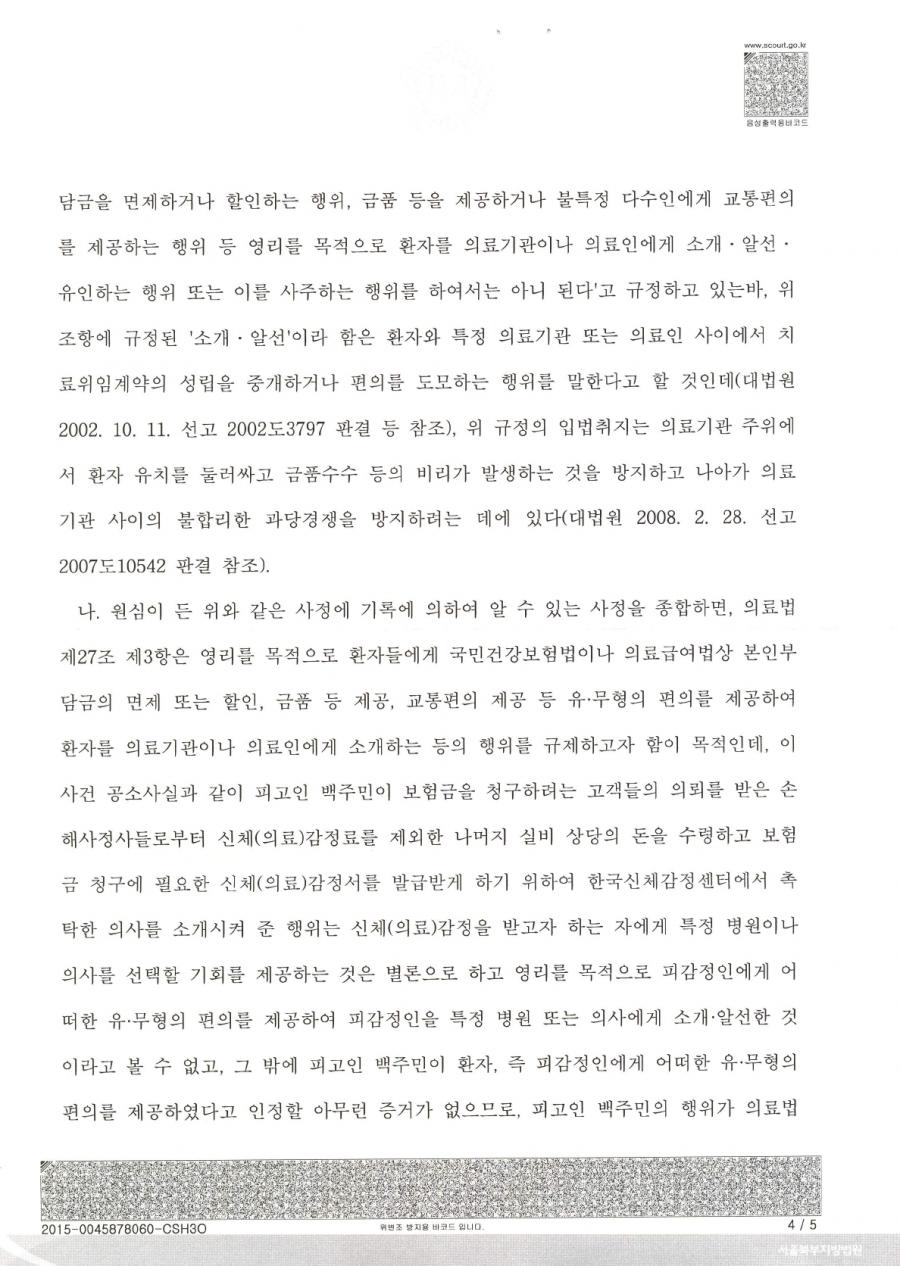 고등법원은 영리를 목적으로 환자를 소개.알선 했다는 검사의 의료법위반은 근거없고 어떠한 증거도 찾을 수 없었다는 이유로 검사의 항소를 기각하고 무죄를 선고하였습니다