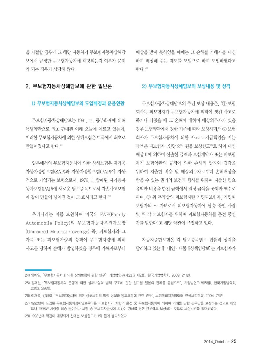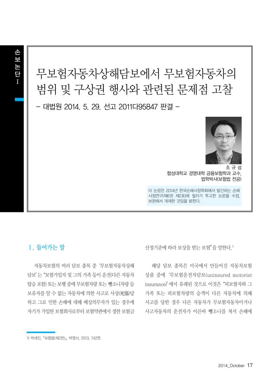 월간 손해보험 2014년 10월호 발췌 _ 무보험자동차상해담보에서 무보험자동차의 범위 및 구상권 행사와 관련된 문제점 고찰